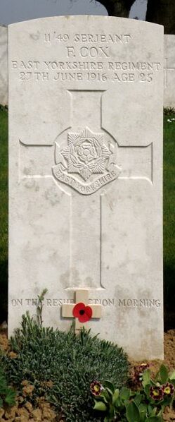 Grave of Sergeant, Frank Cox,,11th Bn EYR, 27/06/1916