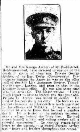 Born in 1890, George was the fifth of seven children to George and Louisa Archer, of 42, Field Street, Holderness Road, Hull. An Insurance Clerk before the war. He worked for the Sun Life Assurance Society, at Lowgate, Hull and for the Company Headquarter’s at Threadneedle Street, London. He had a promising financial future ahead of him. He enlisted at Hull City Hall joining the 10th Battalion East Yorkshire Regiment, ‘The Commercials’, 1st Hull Pals.