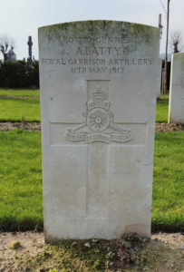 HE ENLISTED IN HULL. ON 07/07/1916. TRAINED AT GREAT YARMOUTH, NORFOLK, LONDONDERRY, BELFAST, WHITE CITY, BRISTOL. POSTED AS A GUNNER, IN THE 213TH ROYAL GARRISON SIEGE ARTILLERY, ON 04/12/1916. HE WAS POSTED TO FRANCE, ON 29/12/1916. KILLED IN ACTION ON 11/05/1917, AGED 37. (Killed in action, serving with 213th Siege Battery, Royal Garrison Artillery. No.4 Gun, probably 8″ Howitzer, took direct hit whilst in action south-east of Henin sur Cojeul, firing on trenches south-west of Fontaine-les-Croisilles. 5 killed, 2 wounded.)