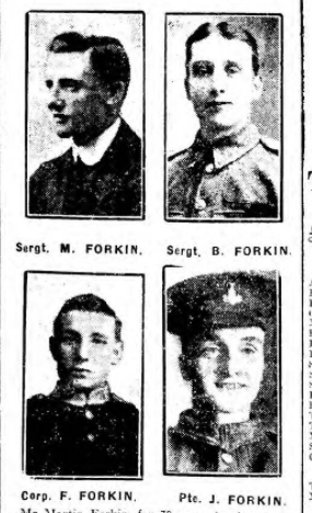 BORN HULL 1887. SON OF MARTIN FORKIN (1854-1930) & ALICE SCANLON (1856-1911), OF 34, LIDDELL STREET, HULL AND 12, CLARA TERRACE, WEST PARADE, SPRING BANK, HULL (WAR PENSION ADDRRESS). HIS MOTHER WAS BORN IN HULL. FATHER, MARTIN, WAS BORN IN IRELAND AND HAD MARRIED AT ST CHARLES BORROMEO CHURCH HULL. HIS FATHER WAS A FORMER ROYAL MARINE, HULL VOLUNTEER, CRACK MARKSMAN AND HAD WORKED FOR HULL CORPORATION FOR THIRTY YEARS. HIS FOUR SONS SERVED IN THE WAR.