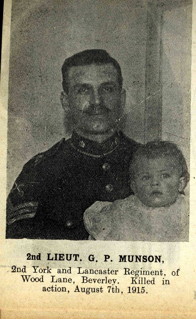 2nd Lieutenant George Philip Munson, York and Lancaster Regiment, formerly Staff Sergeant Army gymnastic staff, was born in 1885 in Kersey, Suffolk, the eldest child of George Munson, a farm worker and his wife Sarah. George was killed in action on 7 August 1915. He left a widow Lilla, whom he had married in 1909 while stationed in Pontefract, and three small children, who lived in Wood Lane, Beverley.
