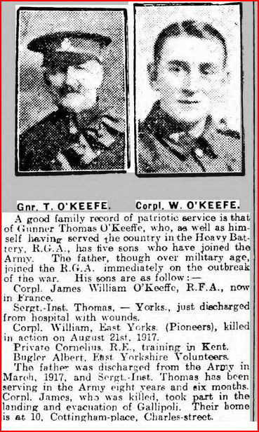 All his five brothers served in the war. Even his father, a former Sergeant, in the Royal garrison Artillery and well over military age enlisted, on the 24/09/1914. The O’Keefe’s were featured as a patriotic family in the Hull Daily Mail. His father was discharged with wounds in 1917.