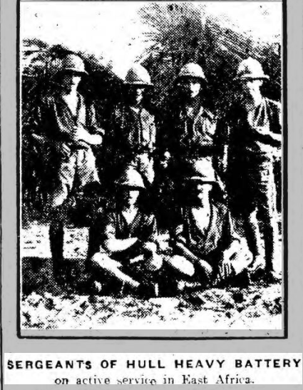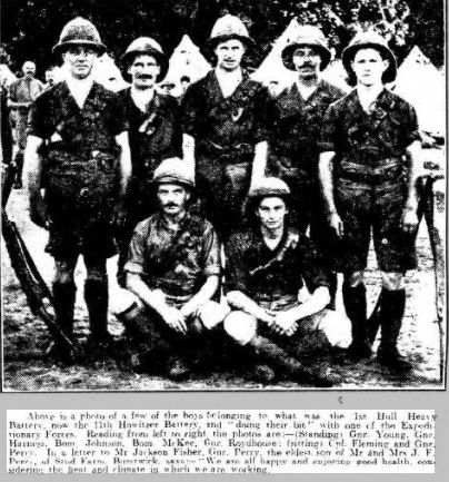 The 1st Hull Heavy Battery was recruited from Kingston upon Hull. It was the first unit of the Royal Garrison Artillery raised for ‘Kitchener’s Army‘ and it went on to serve as a howitzer battery in the East African Campaign and as a siege battery on the Western Front. In September 1914, Lord Nunburnholme who was simultaneously raising the ‘Hull Pals’ Brigade (10th–13th Service Battalions of the East Yorkshire Regiment), also raised the 124th (2nd Hull) and 146th (3rd Hull) Heavy Batteries and the 31st (Hull) Divisional Ammunition Column. Lord Nunburnholme borrowed Hull City Hall and opened it on 6 September as the Central Hull Recruiting Office for all the units being raised in the city. Douglas Boyd, a Hull Corporation employee, was commissioned as Lieutenant and appointed recruiting officer. By 15 September, 80 men had been enrolled for the battery, many drawn from the shipbuilding and engineering firms in Hull, while drivers came from the rural villages of the East Riding. It reached its full war establishment by mid-December, when it was authorised to recruit an additional depot section to supply reinforcements.