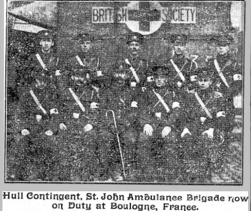 Hull’s St John’s Ambulance Association, was part of the British Red Cross Organisation and formed in Hull, in 1883. During the war, the St Johns Ambulance (Hull Corps) had over 1,000 members, serving on all fronts, and was the largest in England. On 23/04/1915, it held a parade at Hymers College, which included 400 staff and 250 nurses in their distinctive uniforms. It provided 500 voluntary nurses for VAD Hospitals, in and around Hull and staffed the Paragon Rest Station. It helped remove 5000 patients from hospital trains to the Hull Naval and VAD Hospitals, via three motor ambulances (contributed by Hull people, the Pacific Club and Hull Showmen Guild and the Hull Co-operative Society), and two horse ambulances. St John’s staff made 700-800 beds available for casualties and sick, in Hull. Many joined the Royal Army Medical Corps and the three Voluntary Field Ambulance Units (one composed entirely of Hull men), under the command of Major, Hammersley Johnson. The volunteers of the Hull VAD, St Johns and British Red Cross showed marvellous enthusiasm and self-sacrifice, undertaking unpaid, work at all hours, meeting hospital trains and removing the sick and wounded (HDM 11/05/1918)