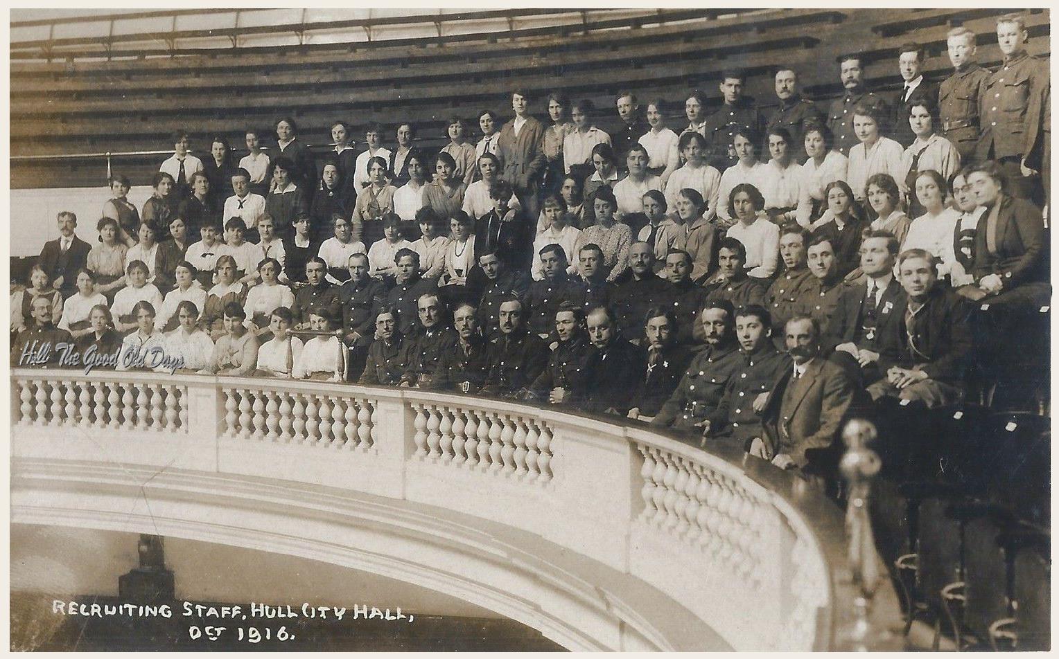 Hull City Hall, was the Main Recruitment Office. It was owned by Hull City Council who paid for its rent, heating and lighting and opened on 1st September 1914. Its larger, more central location provided all the administration associated with recruitment. Led by Mr Douglas Boyd, a Ratings Supervisor, at the Hull Corporation, the City Hall, bedecked with flags and posters, became one of the most efficient recruitment centres in the country. Between 400-500 volunteer Clerks worked in Hull and recruited continuously throughout the war. This included one hundred School Mistresses and lady teachers, who on the 15th August 1915 dealt with over 12,000 recruits.