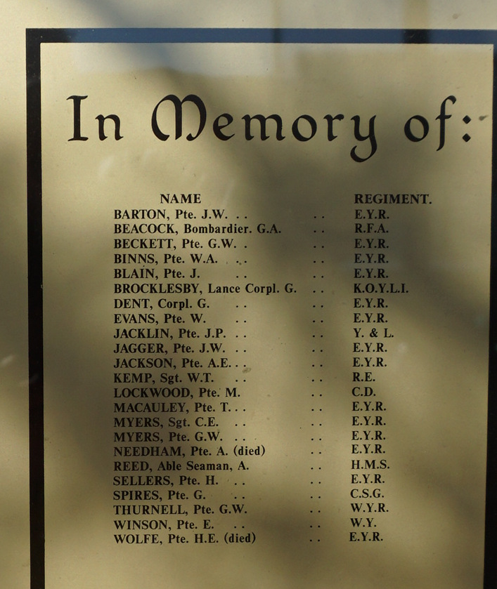 Northumberland Avenue Shrine – 228 men served, of which 7 were killed, 2 drowned, 1 died, 1 died of wounds, 15 wounded, 6 Prisoners of War, and Private, J.L. Elston, EYR, was awarded the DCM.,