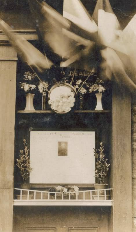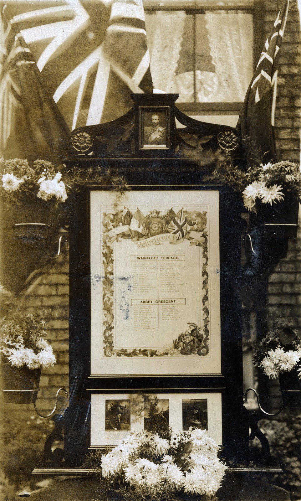 Courtney Street, one of the largest Shrines, compiled by Mrs Russell, of 15 Grove Terrace. 305 names, 2 wounded, 1 missing, 16 dead. (HDM 10/10/1916)