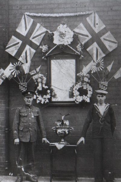The May Terrace shrine on Walker Street, unveiled on 24 September 1916, was described as “of Gothic design, richly upholstered and enclosed in an outer case.” and….. “quite a showplace,…. for the residents put out in a line down the centre, tables containing photos adorned with glasses of flowers and coloured cloth, and there was a homely and pathetic touch furnished by memorial cards of relatives who have lost their lives. A cigar box stood on a table in this terrace, and the hundreds of visitors on Saturday evening [23 September 1916] and again yesterday [24 September 1916] were invited to contribute a copper for our sailors’ and soldiers’ tobacco.” The Church Lads Brigade and a local Boy Scout troop attended, “and the band played the general salute when the vicar drew the curtain.”
