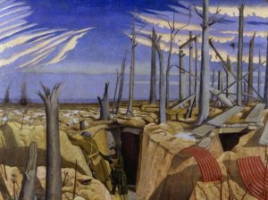 - Oppy Wood, was also immortalised in paint, by war artist John Nash. It is held at the Imperial War Museum (reference ART 2243) and is entitled “Oppy Wood, Evening, 1917“. It is one of a series of paintings commissioned by the British War Memorial Committee set up by the Ministry of Information early in 1918 and is 2 metres high and wide. The lower half of the composition has a view inside a trench with duckboard paths leading to a dug-out. Two British infantrymen stand to the left of the dug-out entrance, one of them on the fire step looking over the parapet into No Man’s Land. There is a wood of shattered trees littered with corrugated iron and planks at ground level to the right of the composition. The sky stretches above in varying shades of blue with a spectacular cloud formation framing a clear space towards the top of the composition.