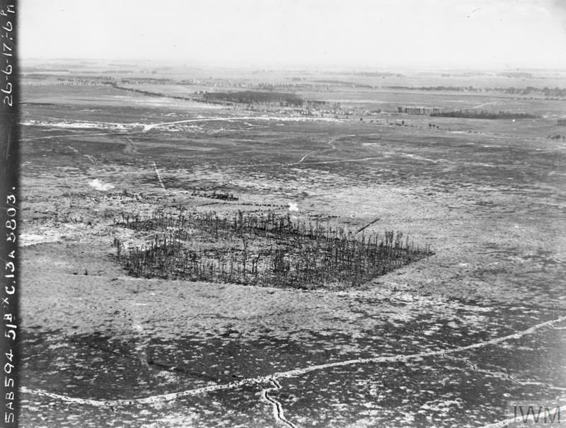 2. Oppy Wood was full of fallen trees and tangled branches which gave the enemy great cover. A long slope of 1,000 metres to the west, left the British field artillery at extreme range. This reduced its accuracy and largely failed to cut the enemy wire.