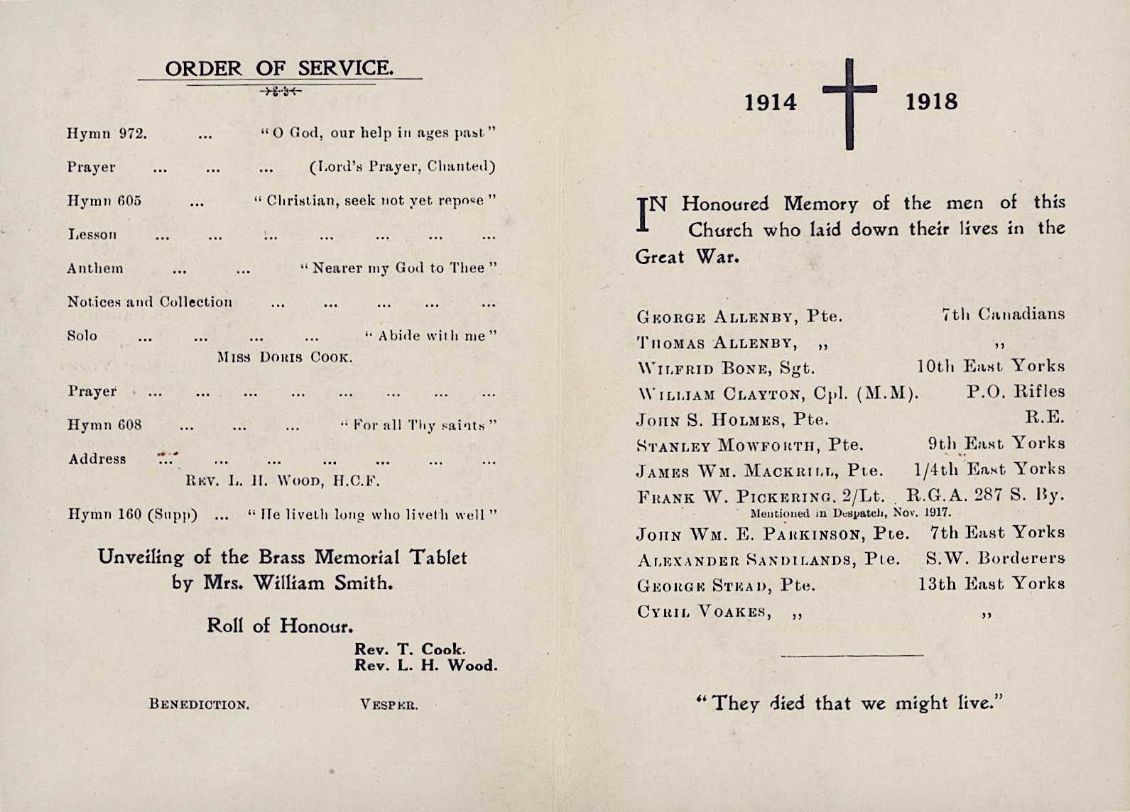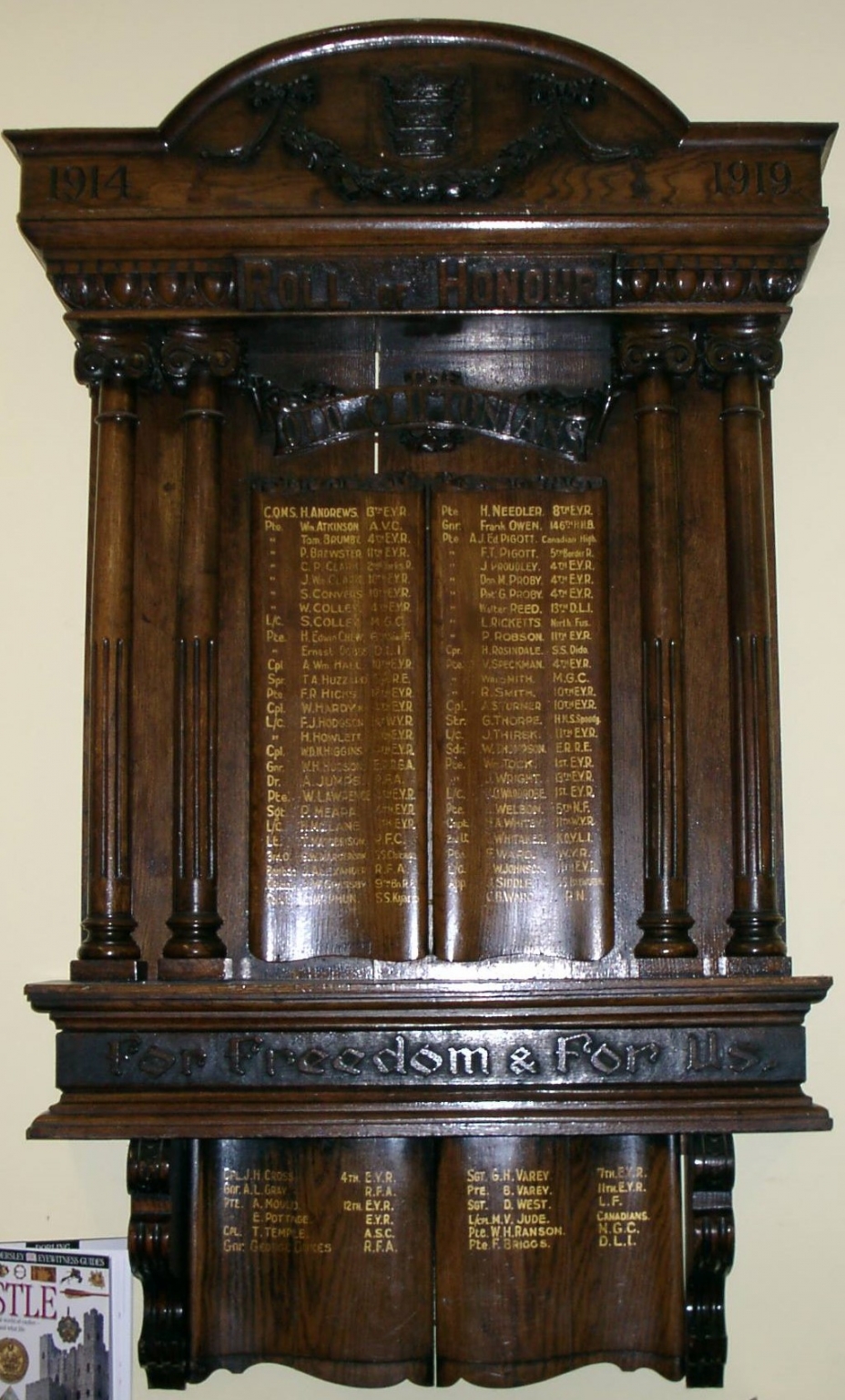 Northumberland Avenue Shrine – 228 men served, of which 7 were killed, 2 drowned, 1 died, 1 died of wounds, 15 wounded, 6 Prisoners of War, and Private, J.L.Elston, EYR, awarded the DCM.