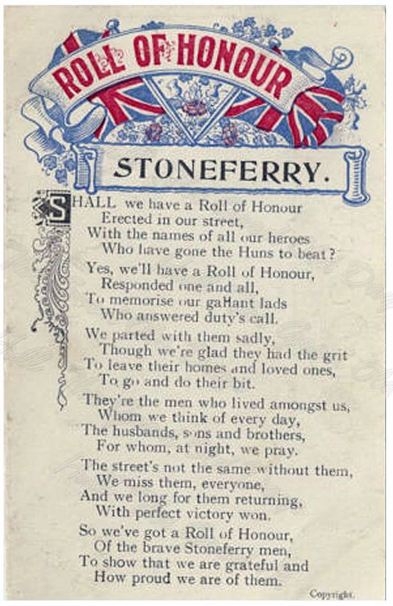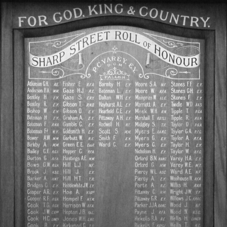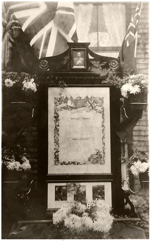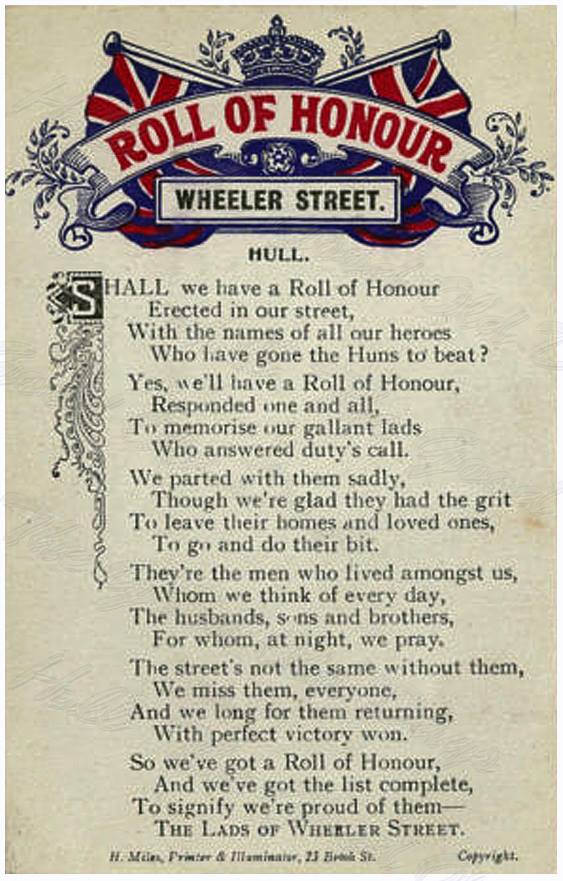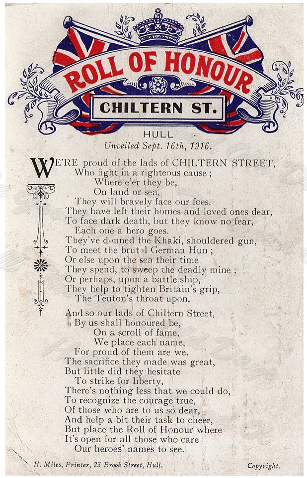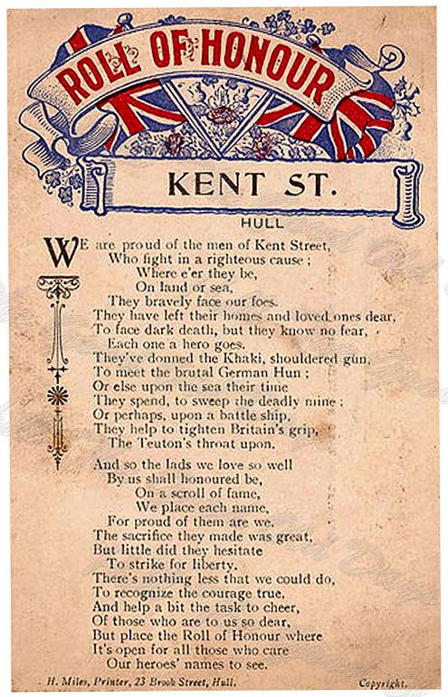 The first and earliest war memorials in Hull, were the ‘Street Shrines’ or ‘Rolls of Honour’, These were created in the early years of the war to commemorate all those locally serving in the armed forces. The idea of Street War memorials started in the East end of London, but it was soon adopted in towns, such as St Albans, and became particularly widespread in Hull.