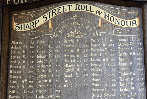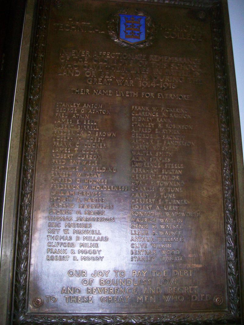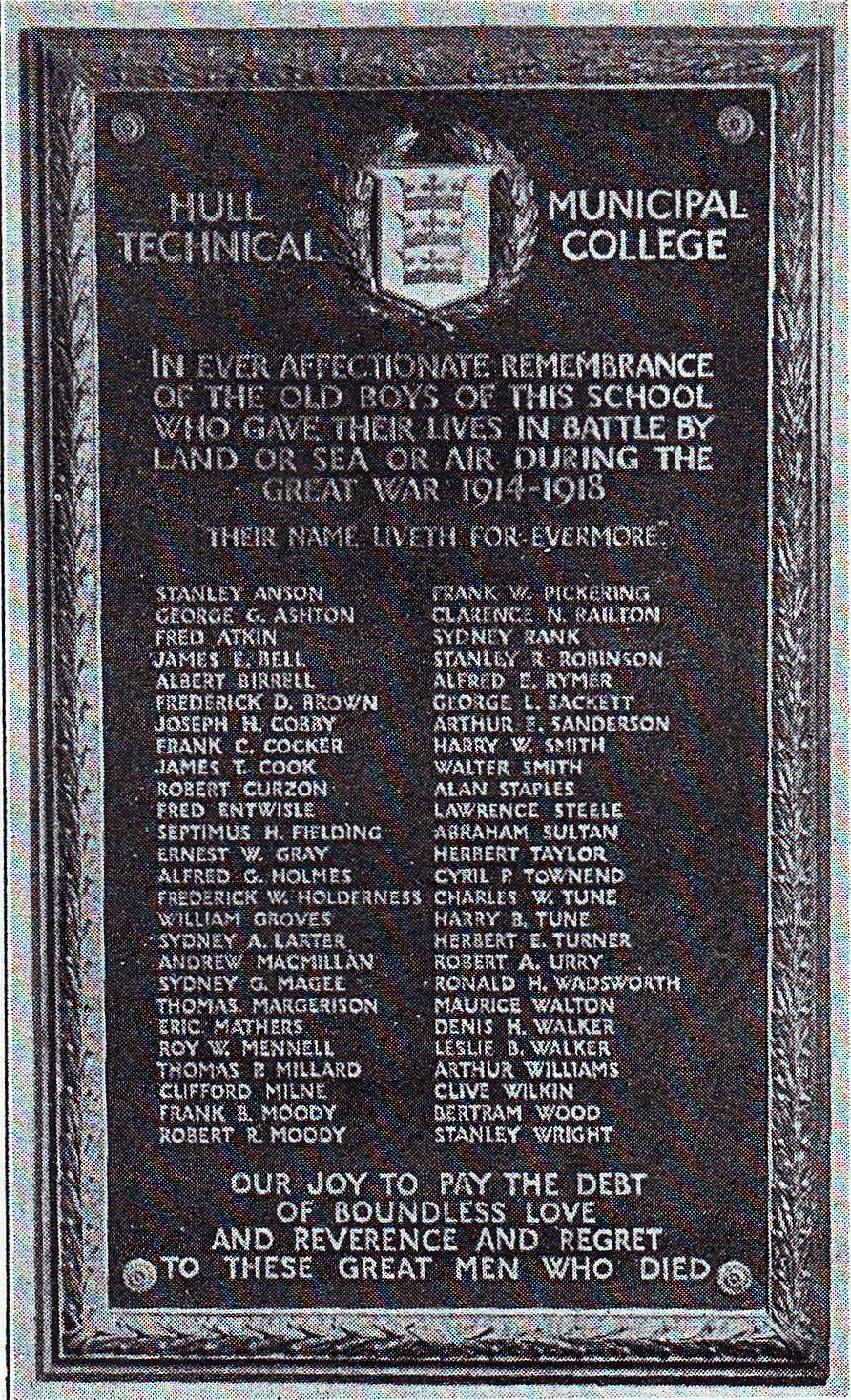 The Hull Post Office, lost at least 46 employees. Schools also produced their own war memorials. Hymers school memorial, contains the names of 116 former Hull pupils. Hull Grammar school memorial lost 88 ex pupils in the Great War. The Clifton Street School Memorial (below) recorded 66 pupils killed in the First World War. Hull’s Municipal Technical College, listed 52 former students on their Park Street memorial. The names of 28 Hull teachers are recorded on a bronze tablet mounted in Hull’s Guildhall.