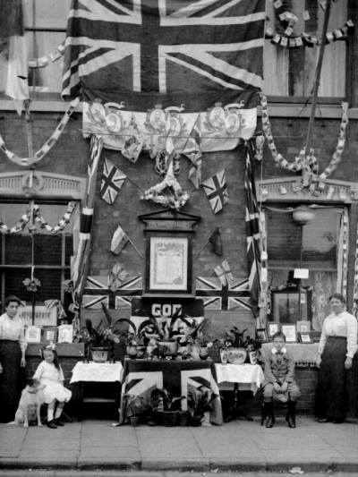 In 1915, St Marks Church was the first to erect a large, wooden board, on the railings outside, showing all the men from St Marks Street serving in the war. The Memorials took many shapes, forms and styles. Some included only those directly involved from the street, others included relatives from other streets. Some ‘Roll of Honours’ covered large areas, such as Wilmington and Sculcoates, which included many streets. A great deal of work went into designing these ‘Rolls of Honour’. Committees were set up and Ladies went round collecting names, information and money. The names of servicemen, were often written on paper scrolls, or scratched onto wooded boards, and displayed prominently on Street corners. The memorials were often so highly decorated, with flowers, flags and patriotic pictures, that they took the form of ‘Street Shrines’. There was keen competition between Hull Streets for the best memorials. Montrose Avenue, boasted the finest Street Memorial, Courtney Street the largest, and Northumberland Avenue drew the largest crowds. The opening ceremonies were grand affairs, with bands, choirs, hundreds of people attending and widely reported in the local newspapers. It was reported that the unveiling of the Wilmington Roll of Honour, on the 12th November 1916, attracted over 10,000 people (HDM 13/11/1916). Some opening ceremonies caused incidents, such as the unveiling of the New George Street memorial, on the 8th October 1916. Here, Thomas Boast, the local Greengrocer, had failed to display a flag in his shop, and was attacked by a crowd for being unpatriotic. For example, Emily Atkin, from New George Street and Alice Brown, from Scott Street, were fined £5 for breaking his shop window and accusing his wife of being ‘Austrian’.