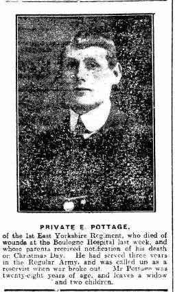 | POTTAGE, ERNEST | Private | 1st East Yorkshire Regiment | 16/12/1914 | 28 | Boulogne Eastern Cemetery, France | 5 | Edith Terrace, Symons Street, Hull |